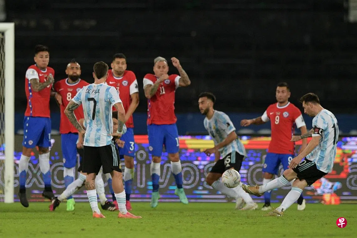 尽管球星梅西(Messi)在上半场踢入招牌式自由球,南美洲足球劲旅阿根廷仍然只能在昨早的A组比赛上以1比1踢和对手智利。