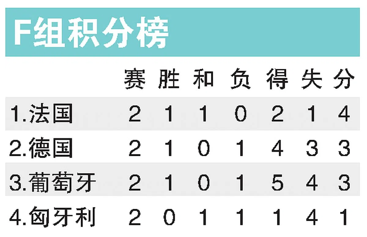 目前在F组中,法国以四分排名第一,德国和葡萄牙同积三分,分列第二和第三位,匈牙利以一分忝陪末席,四队都还有晋级16强赛的希望。在最后一轮小组赛中,德国将碰上匈牙利,法国将与葡萄牙交锋。
