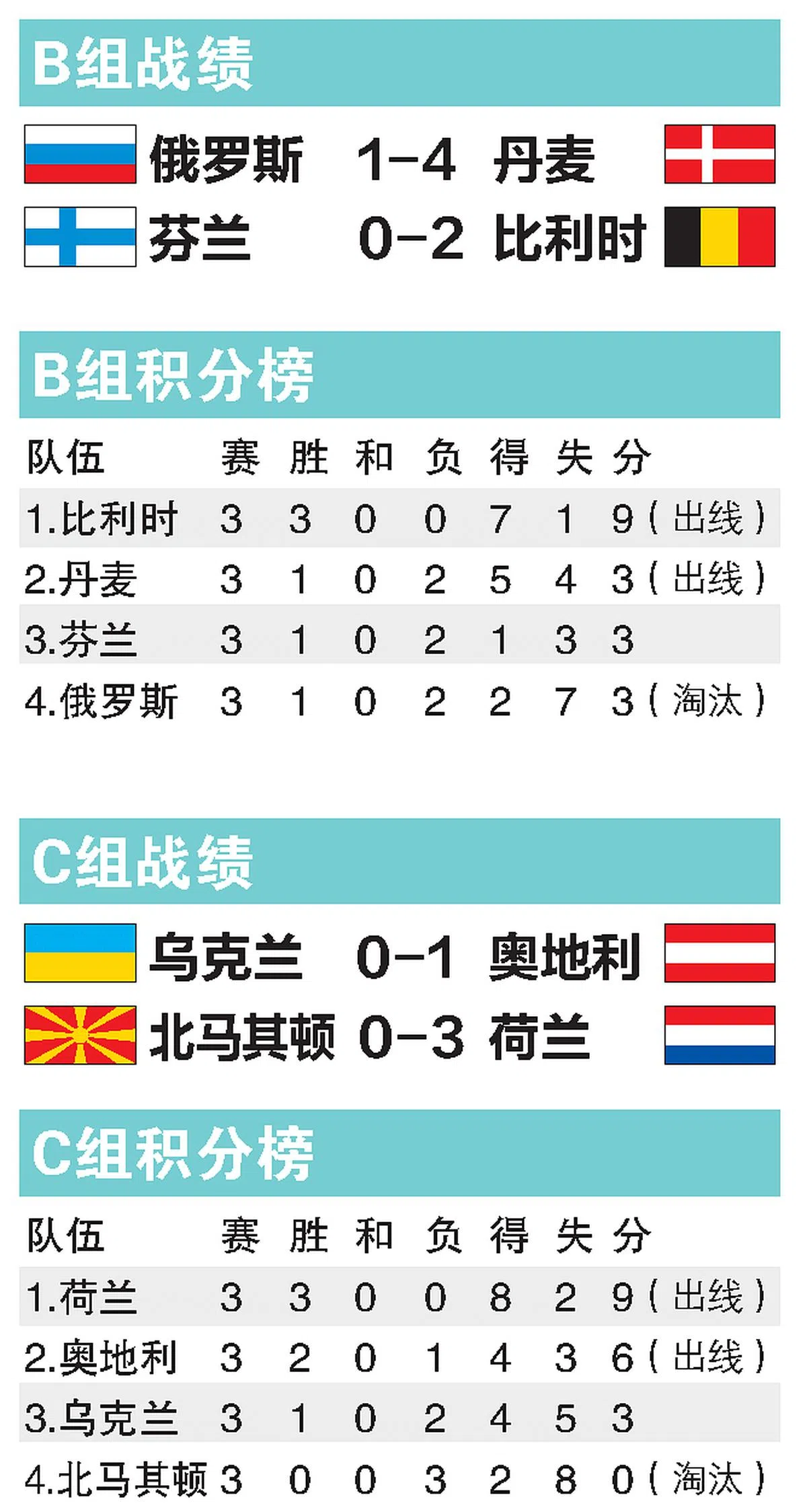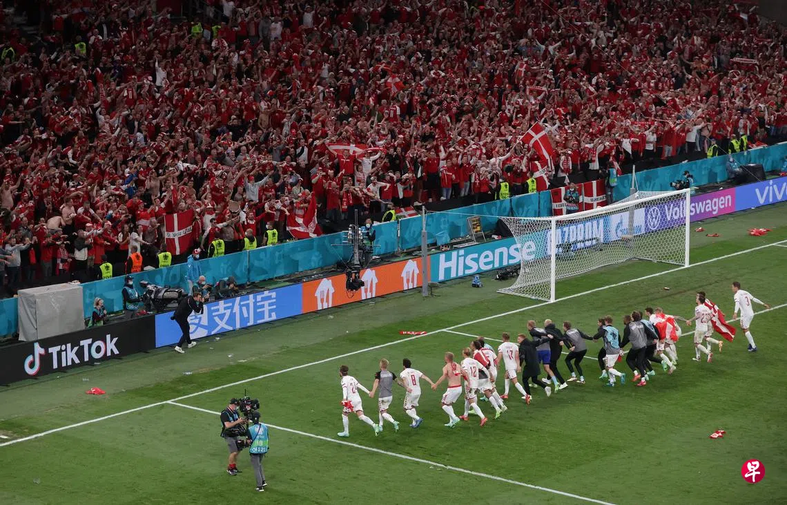 丹麦必须在昨天的最后一轮小组赛至少胜俄罗斯两球,才能以小组副盟的身份进军16强赛。结果该队以4比1横扫俄罗斯,成为欧锦赛历来第一支在首两场小组赛败北后还能晋级淘汰赛的球队。