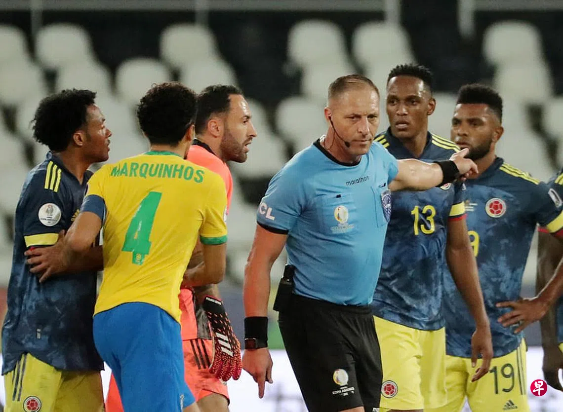 (里约综合电)美洲杯B组小组赛,主队巴西在争议声中逆转哥伦比亚,以2比1获胜。