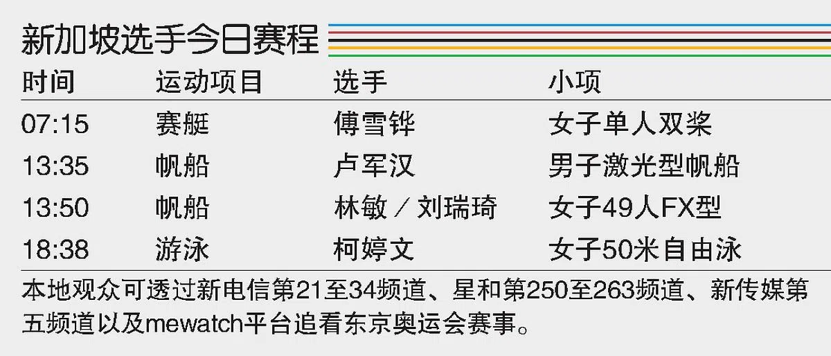 今天新加坡健儿的参赛项目全和水有关,傅雪铧今早会亮相女子单人双桨E组决赛,卢军汉继续参加男子激光型帆船第九和第十回合,队友林敏/刘瑞琦则参加女子49人FX型的第七至第九回合。