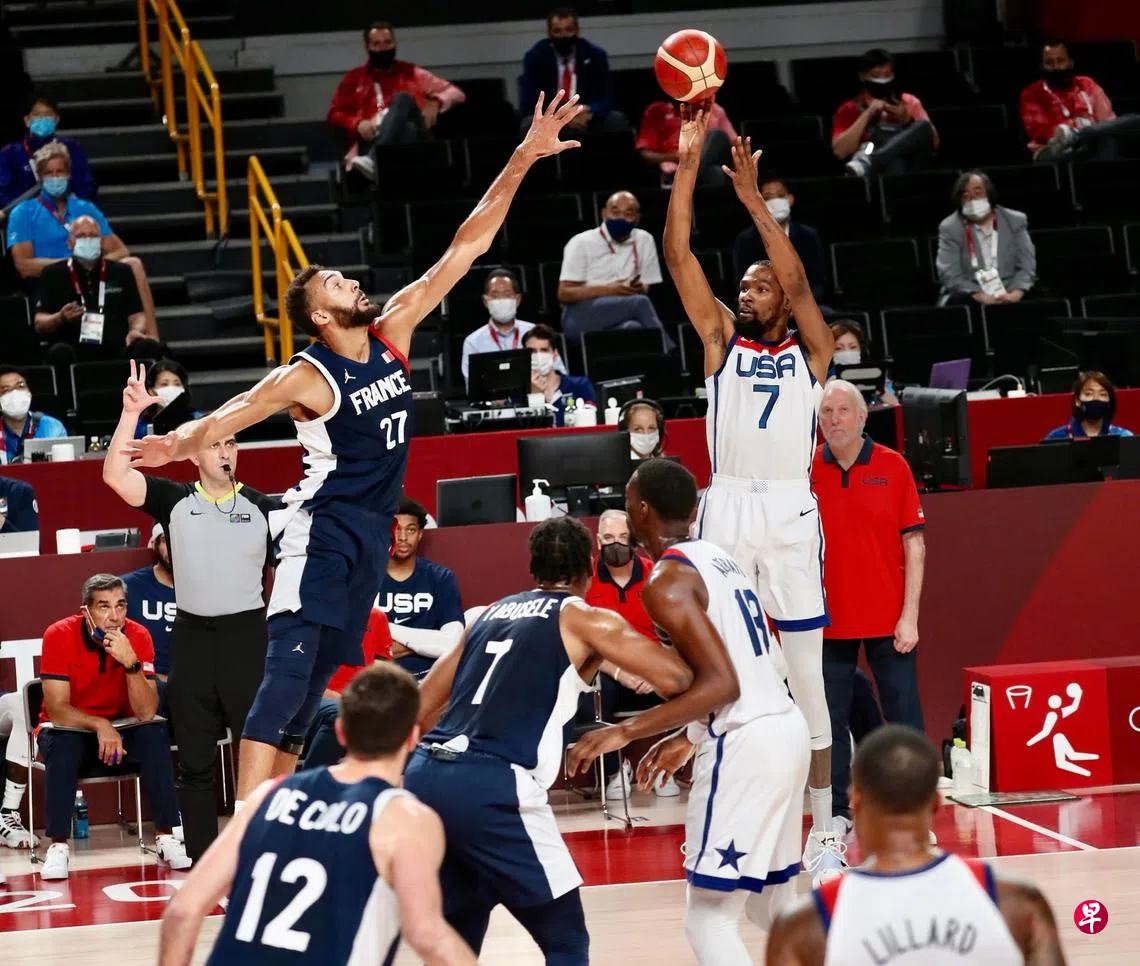 法国队一开就取得10比4的领先,但美国队在杜兰特的飙分秀下,上半场以44比39逆转局势。