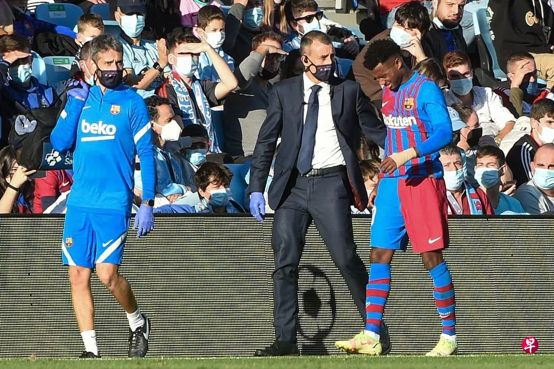 巴塞19岁小将法蒂此役左大腿肌肉拉伤,比赛第46分钟被换下场。