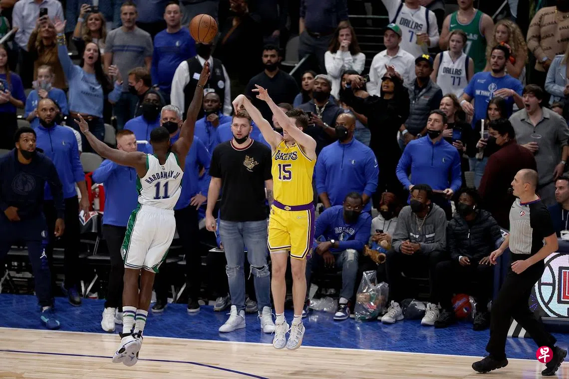 (达拉斯综合电)洛杉矶湖人(LA Lakers)在昨天上午(新加坡时间)的美国职业篮球赛(NBA)与达拉斯小牛(Dallas Mavericks)大战一场。在缺少头号球星东契奇(Doncic)的情况下,小牛在主场与湖人战至加时赛。湖人最终依靠新秀奥斯丁·里夫斯(Austin Reaves)投中三分准绝杀,107比104获胜。