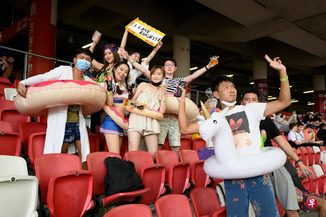 汇丰银行(HSBC)新加坡七人制橄榄球赛昨天回归,在国家体育场上演了首日赛事。已经苦等两年的本地橄榄球迷们纷纷盛装出席。昨天比赛也是我国放松防疫规定后,首个允许在观众席饮食的赛事,这多少让球迷们找回了当年惬意观赛的感觉。