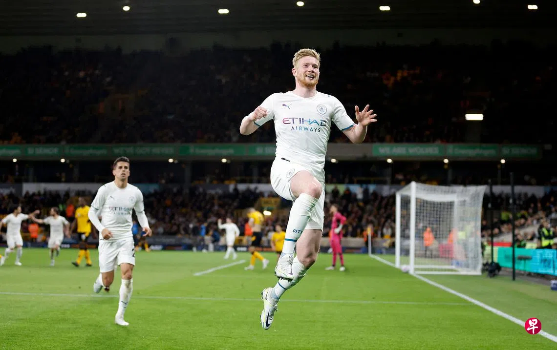 (伍尔弗汉普顿综合电)德布吕纳(De Bruyne)完成“大四喜”(进四球),助英超领头羊曼市(Manchester City)5比1狂胜狼队(Wolves),将积分榜优势扩大至三分,无比接近夺冠。