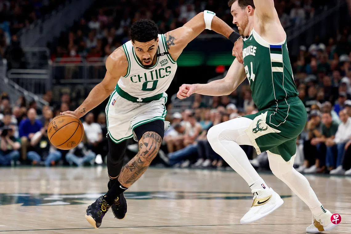 (密尔沃基综合电)塔特姆(Tatum)和安特托孔波(Antetokounmpo)两大球星昨天上午在东岸季后赛中上演飙分大战,最终得到46分的塔特姆技高一筹,带领凯尔特人(Celtics)客场战胜上届冠军公鹿(Bucks),将这组系列赛拖入第七场决赛。