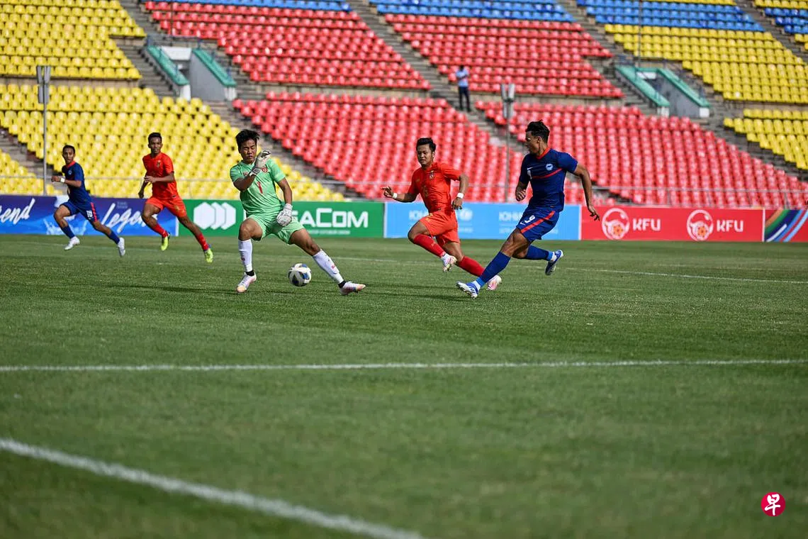 雄狮队在第一场小组赛遭吉尔吉斯斯坦以2比1逆转,然后又0比1败给塔吉克斯坦,已经无望出线。虽然这场球赛已经无关痛痒,但世界排名第158的雄狮对上第152的缅甸,开赛后还是卯足全力拼搏。
