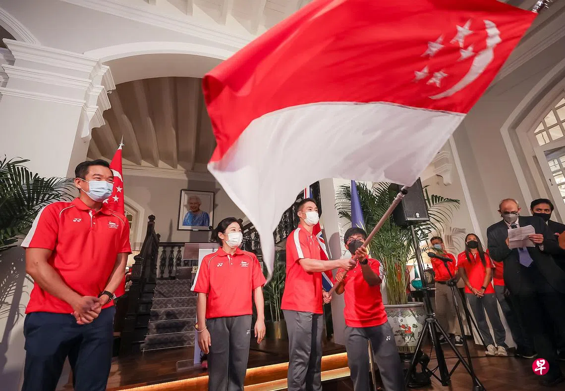 这场授旗礼在那森路英国驻新加坡最高专员官邸伊甸堂(Eden Hall)举行,多名运动员和官员出席这场盛会,我国羽毛球双打好手许永凯和残疾举重好手诺艾妮将担任本届赛事的擎旗手。