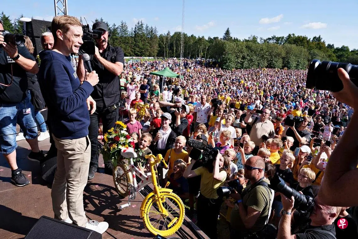 (格林哥里法新电)刚赢的环法脚踏车赛的丹麦车手温格高(Vingegaard)星期四(7月28日)回到乡村老家格林哥里(Glyngore),受到超过2万人英雄式的欢迎。