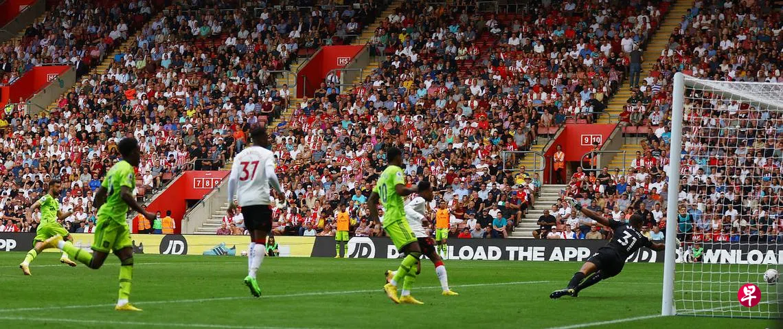 曼联在第19分钟错失黄金机会,费尔南德斯禁区头球顶偏,得球的埃兰加(Elanga)劲射被门将巴祖努(Bazunu)扑出。乱军之中球落到埃里克森(Eriksen)脚下,但他的凌空抽射被贝拿·高卓普(Bella-Kotchap)神勇拦截。
