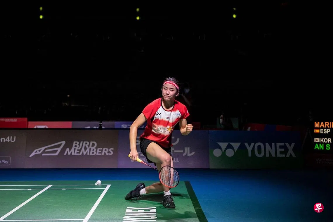 女单四人中,只有韩国天才少女安洗莹苦战三局,拿下西班牙前奥运冠军卡罗琳娜·马琳。