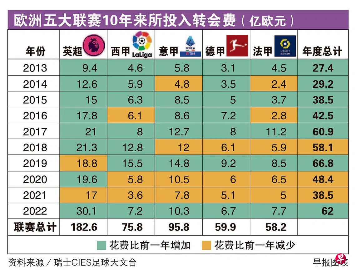 从数据来看,欧洲五大联赛今年的转会投入,都比疫情前两年高,显示转会市场逐渐回温。英超在更多财团入驻下,更是“报复性消费”写新高。