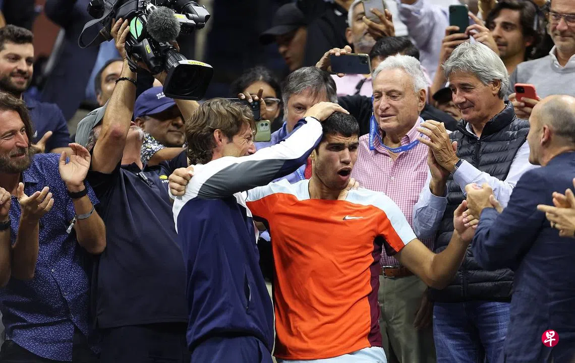 四盘比赛比数分别是6比4、2比6、7比6(1)和6比3。胜出后,阿尔卡拉斯躺在地上,双手掩面庆祝胜利。