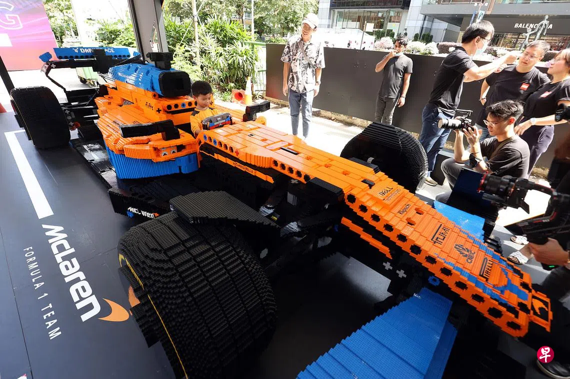 世界一级方程式赛车(F1)新加坡站将登场,积木公司乐高和迈凯伦车队合作,用28万8315块积木打造了一辆实际大小的迈凯伦赛车模型,即日起在义安城前的空地展出。这辆乐高积木赛车长5.7米,宽2.4米,花了1893小时,即将近79天制作,复刻了赛车方向盘和用来保护车手的Halo系统等装置。公众也能坐进驾驶舱拍照。模型将一直展出至F1新加坡站正赛10月2日当天,时间是每天上午11点至晚上9点30分。