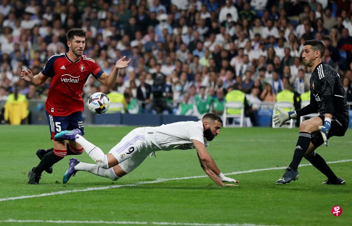 (马德里路透电)法国国脚本泽马(Benzema)在最后关头踢失罚球,让皇家马德里(Real Madrid)在本地时间星期一(10月3日)凌晨的西甲联赛主场以1比1踢和奥萨苏纳(Osasuna),排名跌至第二。