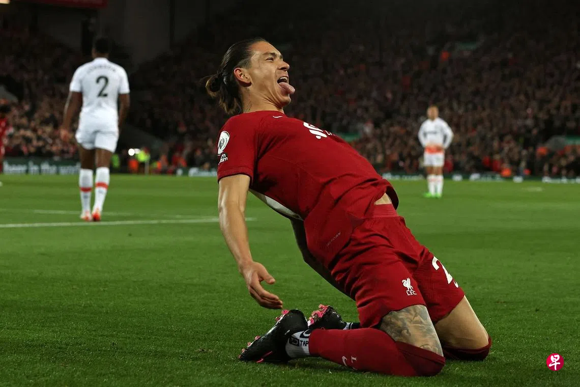 红军主帅克洛普(Klopp)本仗将上仗击败曼市的4-2-3-1阵形改为4-4-2,重新召入努涅斯(Nunez),与菲尔米诺(Firmino)出任双箭头,结果前者不负众望,在第22分钟冲顶破门。这是努涅斯近四场比赛的第三个进球,同时也是他在安菲尔德球场(Anfield)首次进球“开斋”。