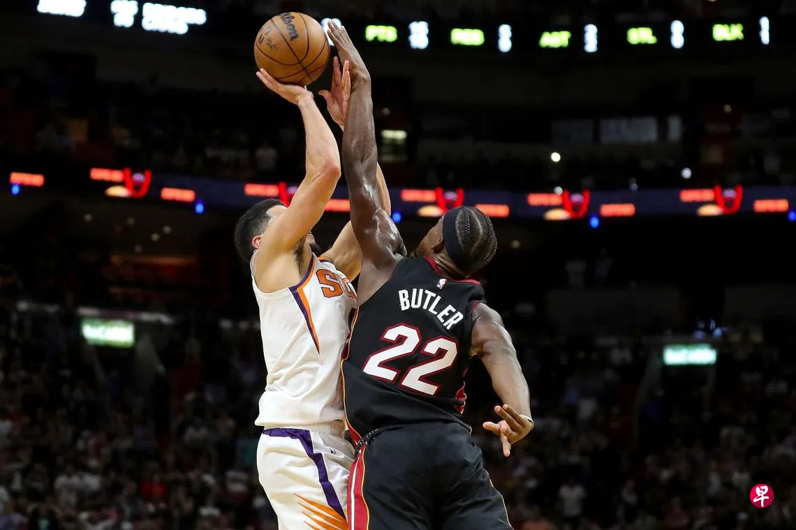 (迈阿密综合电)美国职业篮球赛(NBA)东西岸两支劲旅迈阿密热浪(Miami Heat)和菲尼克斯太阳(Phoenix Suns)新加坡时间星期二(11月15日)直接对话。热浪主将巴特勒(Butler)最后时刻成功封盖了太阳主将布克(Booker)的投篮,热浪113比112以一分优势险胜。