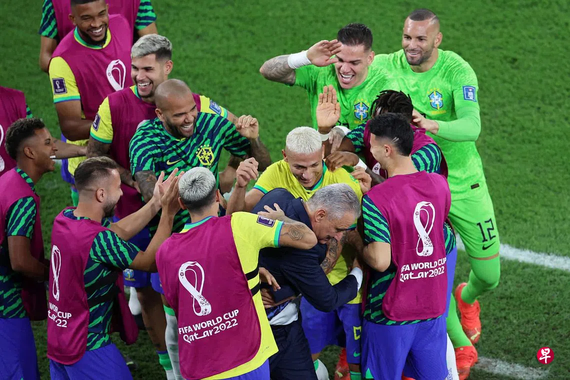 在星期二(12月6日)凌晨结束的16强对阵韩国的比赛中,巴西理查利森(Richarlison)在比赛第29分钟攻进一球,帮助巴西取得3比0领先。进球后,巴西队的球员纷纷冲到教练席上欢庆,61岁主帅蒂特也加入到跳舞的行列之中。