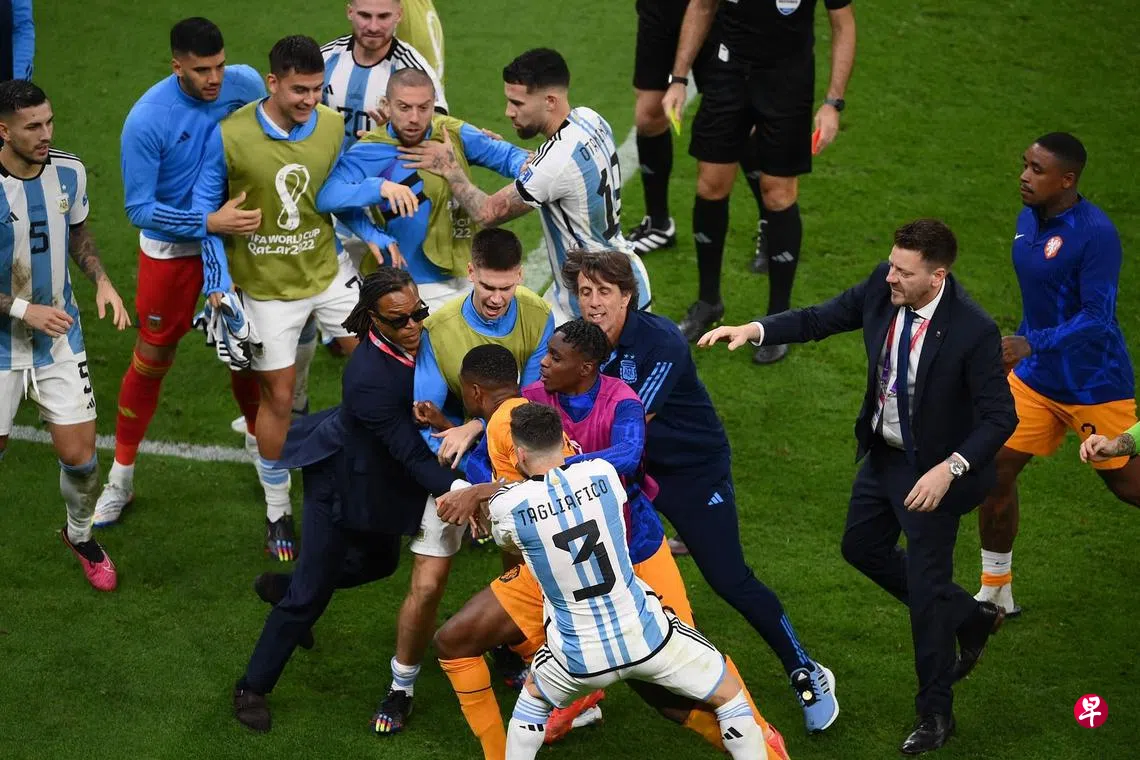 两队第一次爆发冲突是在正赛完场前几分钟,当阿根廷的帕雷德斯(Paredes)在与荷兰球员阿克(Ake)展开激烈拼抢后,又将球踢进荷兰队的替补席时,荷兰队长范戴克(Van Dijk)随即冲上前将他撞倒,两队球员之后开始大打出手。