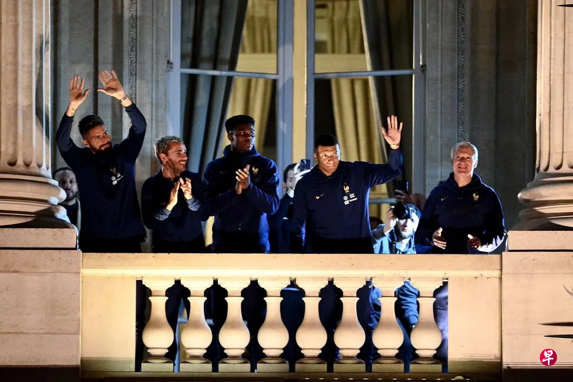 尽管无缘卫冕世界杯很失望,但所有24名参赛球员,包括获得金靴奖的前锋姆巴佩(Mbappe),都出现在阳台上,以掌声向大家表示感谢。