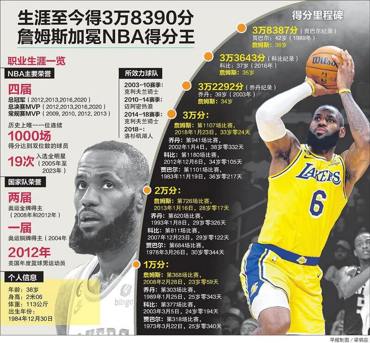 时隔39年后,美国职业篮球赛(NBA)得分王终易主。洛杉矶湖人球星詹姆斯(James)本地时间星期三(2月8日)早上在万众瞩目下打破湖人名宿贾巴尔(Abdul-Jabbar)的纪录,在对垒俄克拉荷马城雷霆(Oklahoma City Thunder)的比赛中砍下全场最高的38分,以3万8390分成为NBA总得分最高的球员。
