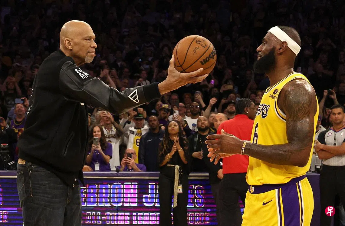随即比赛暂停,詹姆斯高举双手庆祝,摄影师涌入球场,贾巴尔从座位上站起鼓掌,詹姆斯的家人也到场上见证这历史性一刻。球场屏幕播放了詹姆斯职业生涯的高光时刻,贾巴尔带着一个篮球,和NBA总裁萧华(Silver)入场,和詹姆斯握手及拥抱。
