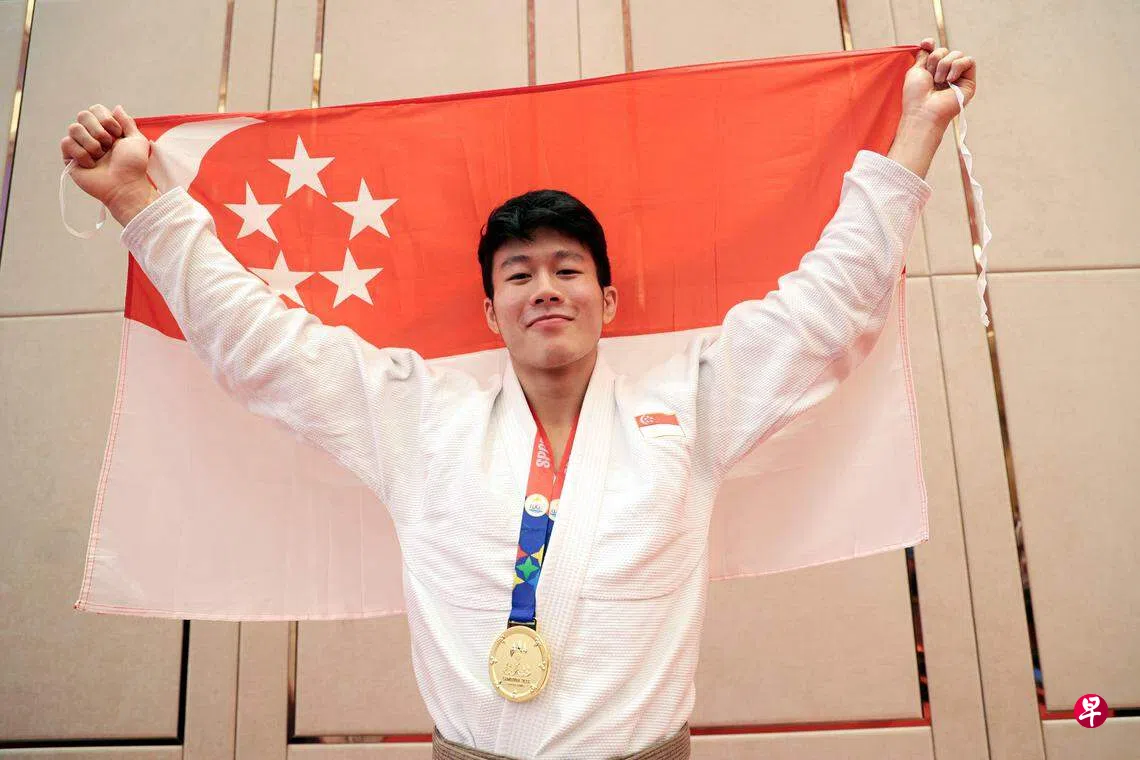 在上届东运会比赛“升量级”夺金后,我国巴西柔术好手林天润这次面对另一个挑战——他在一星期前尾指脱臼,但这并没有阻止他打败强敌,在星期六(5月6日)傍晚的男子69公斤及以下级(有道服)比赛中,夺得我国在本届赛事的首面金牌。