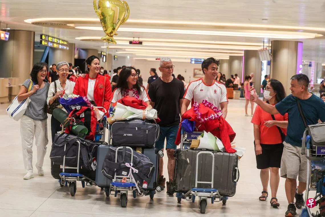 新加坡游泳队在本届东运会以22金15银10铜收官后,于星期五(12日)乘搭新航班机凯旋,在樟宜机场第二搭客大厦获超过50名支持者的热烈欢迎,其中有小小粉丝为柯家大姐柯婷文送上大大的气球和鲜花。