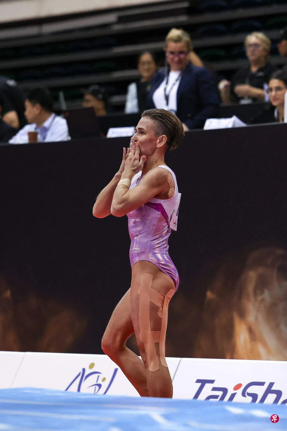 竞技体操亚锦赛星期六继续在新加坡体育城进行,来自乌兹别克斯坦的体坛常青树奥克萨娜在女子跳马项目中取得13.517分的高分,摘得银牌,赢得近700名现场观众的满堂喝彩。