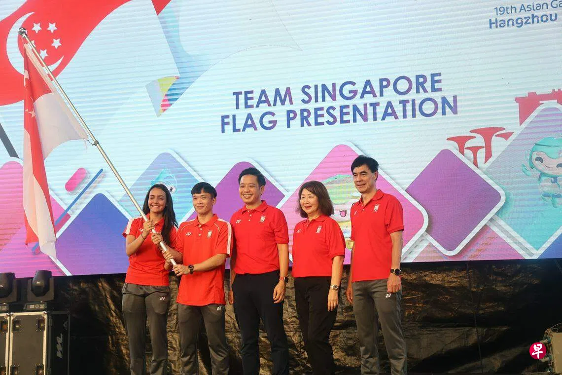 杭州亚运会授旗仪式星期六(8月5日)上午在华侨银行广场(OCBC Square)举行,击剑女将阿米塔和武术男运动员林思韦以擎旗手的身份亮相,全国奥理会代主席潘黄惠珍、贸工部兼文化、社区及青年部政务部长陈圣辉、团长许坤德医生、两名副团长陶李、许圣隆和即将出征亚运会的大部分运动员都出席了活动,但不见约瑟林踪影。