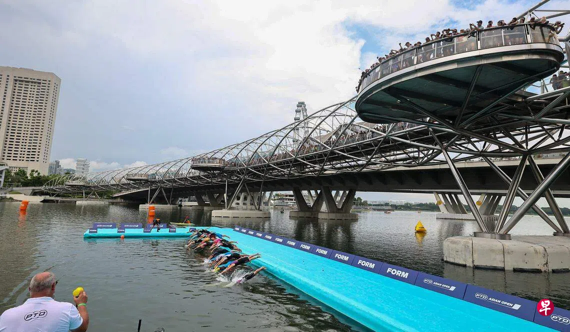 我国今年首次举办亚洲铁人三项公开赛,女子组职业赛星期六(8月19日)下午在滨海湾一带展开。20名世界级女将从滨海湾螺旋桥下的浮动平台出发,在鸣笛之后鱼跃跳进水中。