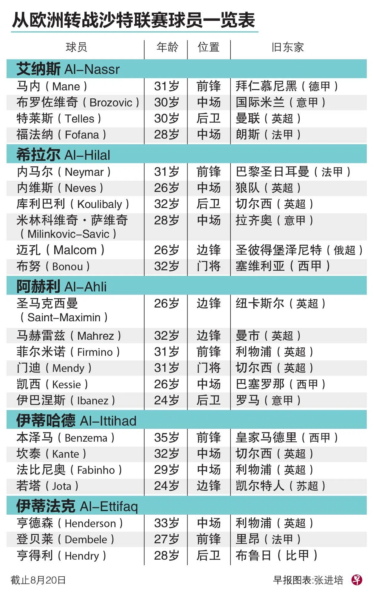 截至目前,拥有沙特阿拉伯公共投资基金会(PIF)撑腰的沙特传统劲旅艾纳斯(Al-Nassr,也译利雅得胜利)、希拉尔(Al-Hilal,也译利雅得新月)、伊蒂哈德(Al-Ittihad,也译吉达联合)、阿赫利(Al-Ahli,也译吉达国民)和同样财大气粗的伊蒂法克(Al-Ettifaq,也译达曼协作)已从欧洲各大联赛招揽了超过20名球员,大家是不是已有点跟不上他们的引援步伐,不晓得哪位球星去了哪家球会?