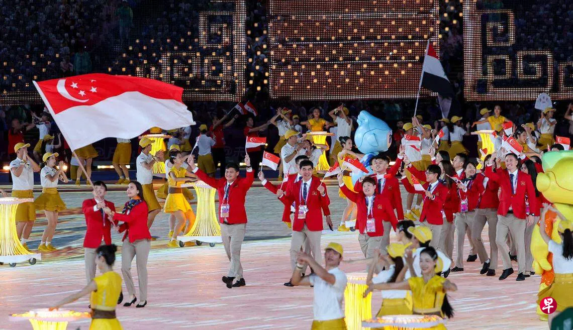 我国一共有129名运动员与工作人员出席开幕仪式,武术选手林思韦和击剑手阿米塔担任擎旗手,带领新加坡代表团步入会场。