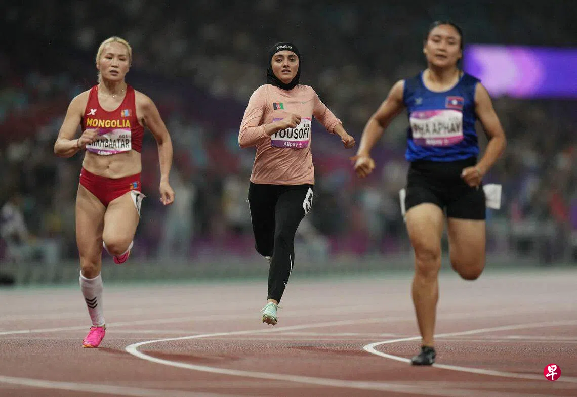 (杭州法新电)阿富汗女短跑运动员基米娅(Kimia Yousofi)在星期五(9月29日)参加亚运会比赛时,表达了对塔利班政权压迫女性的抗议。