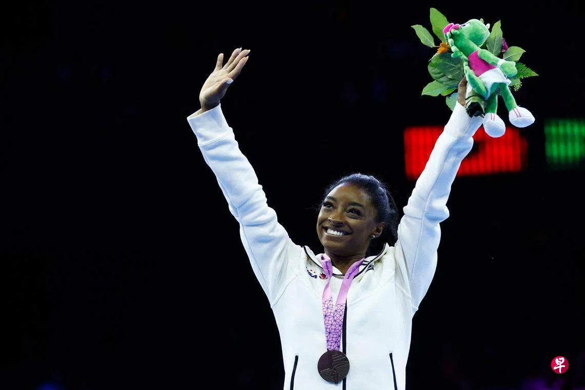 (安特卫普法新电)26岁的美国体操名将西蒙妮·拜尔斯(Simone Biles),在星期天(10月8日)体操世锦赛再夺平衡木和自由操两枚金牌,以四金一银的成绩为重返阔别两年的国际赛事画上完美句点,同时已累积了23个世锦赛冠军头衔。