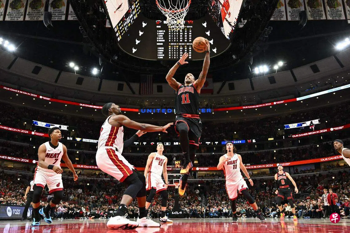 (芝加哥综合电)芝加哥公牛(Chicago Bulls)在本地时间星期天(11月19日)上午的美国职业篮球联赛(NBA)常规赛最后一分钟上演了戏剧性反转,主场以102比97战胜迈阿密热浪(Miami Heat)。