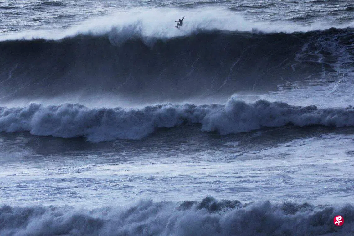 (半月湾路透电)旧金山以南40公里的著名冲浪点梅弗里克斯海滩(Mavericks Beach),星期四(12月28日)迎来了罕见巨浪,吸引大批冲浪者和公众前来打卡。