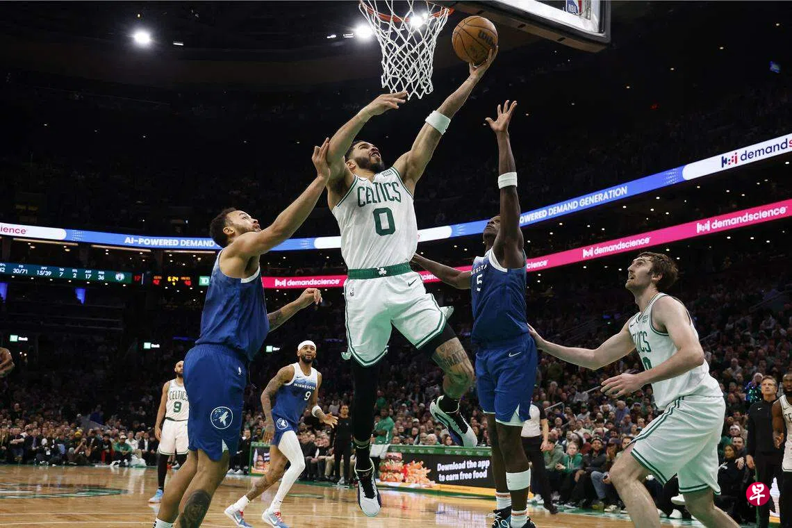 分别领先东岸和西岸联盟的凯尔特人和灰狼上演强强对话,结果让前者主将塔图姆(Tatum)抢尽风头。他整场球赛砍下全场最高的45分,其中26分是在第四节和加时战中夺得的。他在最后一分多钟,两队120战平时,通过一记上篮、一个三分球和两个罚球连取七分,协助球队锁定胜局。
