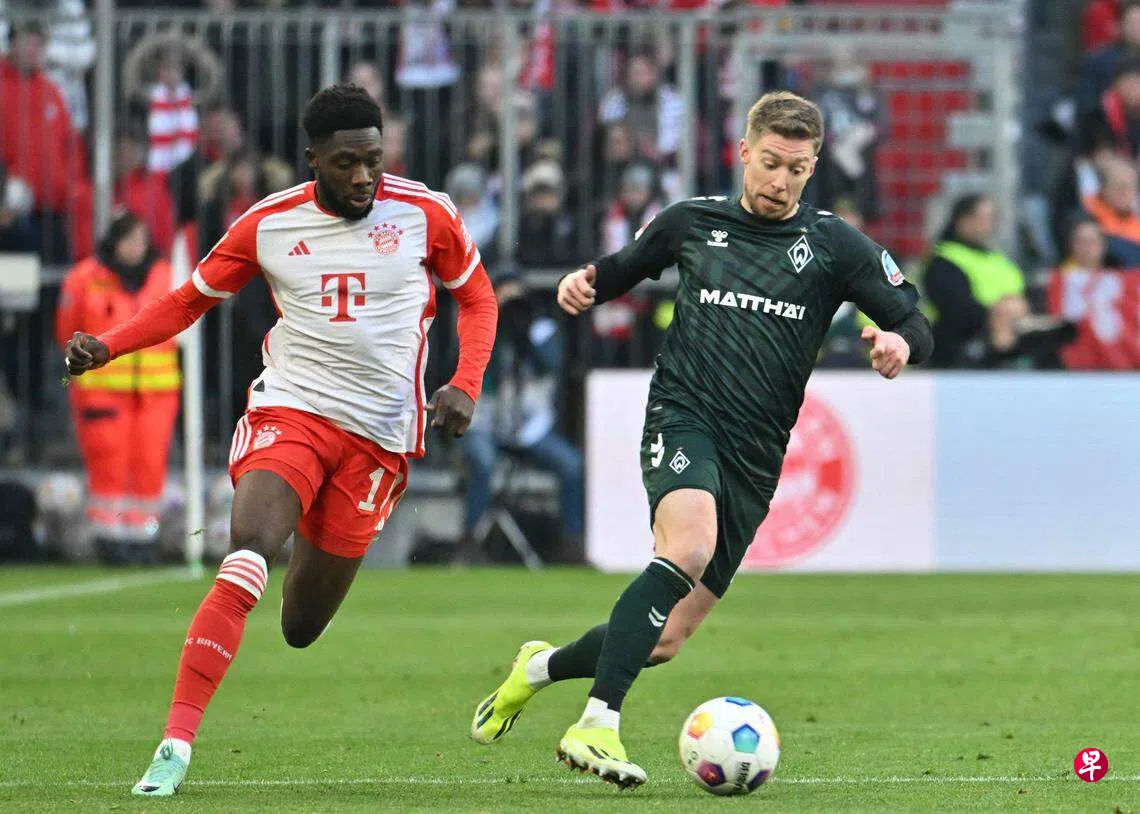 上赛季以净胜球优势艰难卫冕德甲的拜仁,本季表现不及莱沃库森(Leverkusen),本轮之前以四分落后。随着莱沃库森本轮较早前以3比2战胜莱比锡(Leipzig),拜仁本仗又0比1败给不来梅,两队的差距已扩大至七分之多,少赛一场是拜仁唯一的安慰。