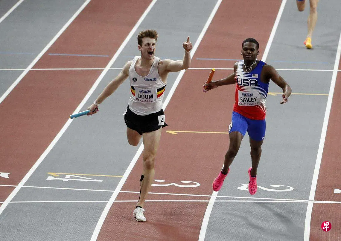 (格拉斯哥综合电)400米冠军杜姆(Doom)在世界田径室内锦标赛收官日发威,本地时间星期一(3月4日)在男子4X400米接力赛最后一棒超越美国选手拜利(Bailey),助比利时以0.06秒的微小优势实现该项目两连冠。