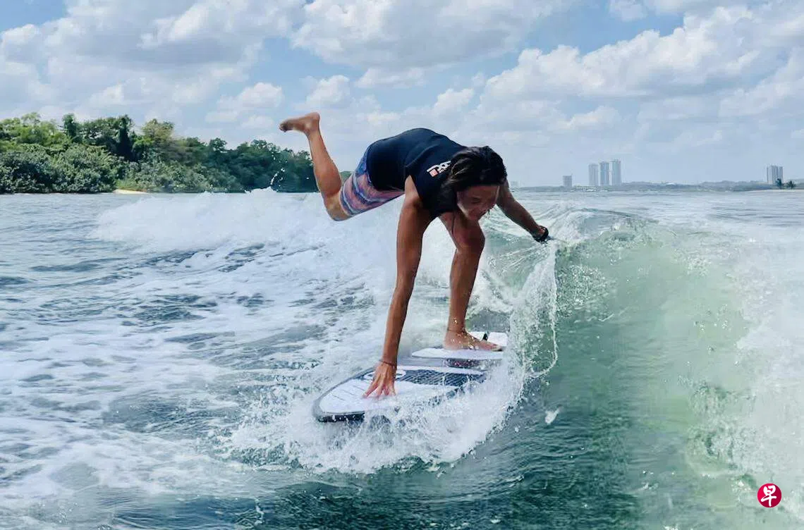 潘芷薇玩尾波冲浪已有18年的时间,如今她在本地水上运动机构Ryders担任教练,时常带着学员从榜鹅滨海乡村俱乐部(Punggol Marina Country Club)出发,乘坐快艇到实里达岛(Seletar Island)附近的水域教学。