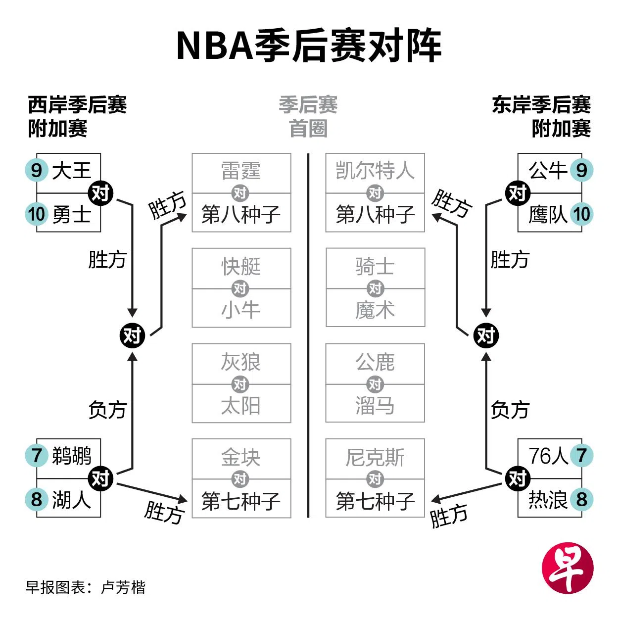 东岸的另外两个附加赛资格分别落入公牛与鹰队之手,两队之间的胜者将与热浪与76人之间的败者争夺季后赛首轮东岸第八种子的席位。
