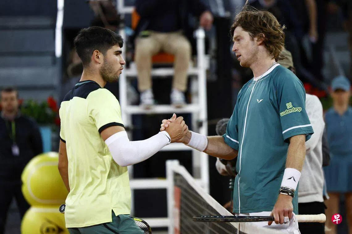 (马德里综合电)西班牙新星阿尔卡拉斯(Alcaraz)星期三(5月1日)在马德里网球公开赛遭俄罗斯选手卢布列夫(Rublev)逆转,无缘半决赛。