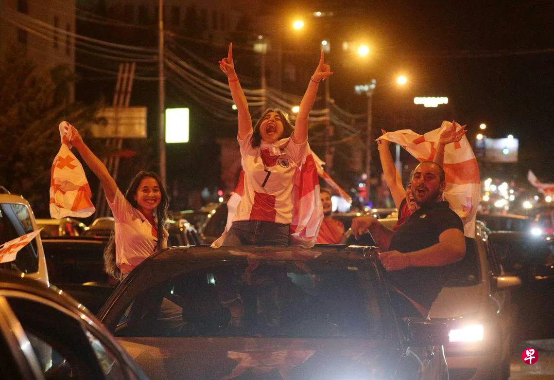在击败葡萄牙,确定晋级欧锦赛16强后,格鲁吉亚首都第比利斯可说是陷入疯狂,人们在街道上鸣笛庆祝。
