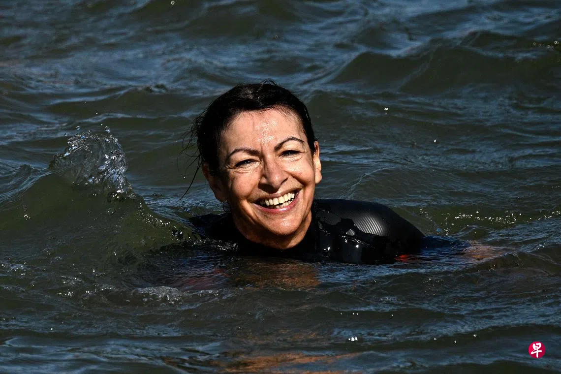 巴黎市长安妮为了展示塞纳河水质已获得改善,身穿潜水衣和护目镜,与巴黎奥运会和残奥会主席埃斯坦盖,以及一些俱乐部泳手一起下水游泳。