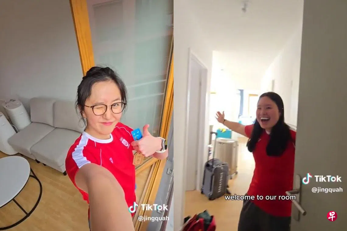 在接力赛项目上负责蝶泳棒的柯敬文拍了一段视频分享在Tiktok,她在视频中介绍了四个女生的房间。这是一个拥有两间房间、一间厕所的住所,外面也挂了新加坡全国奥理会和新加坡国旗。