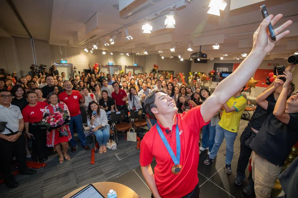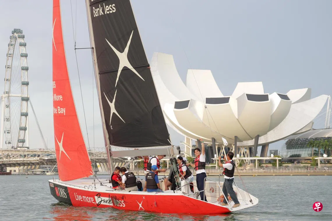 我国巴黎奥运会男子水翼风筝板铜牌得主墨士廉,星期六(8月17日)和队友们参与了由新加坡帆船总会在滨海湾水域举办的帆船游行。