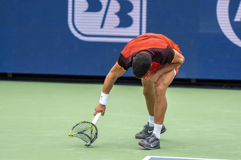 阿尔卡拉斯在新加坡时间上星期五(8月16日)的辛辛那提大师赛次圈赛中,6比4、6比7(5比7)、4比6输给法国好手孟菲尔斯(Monfils),身为法网和温网冠军的他在比赛中失态,暴露不满情绪,愤怒之下砸球拍。
