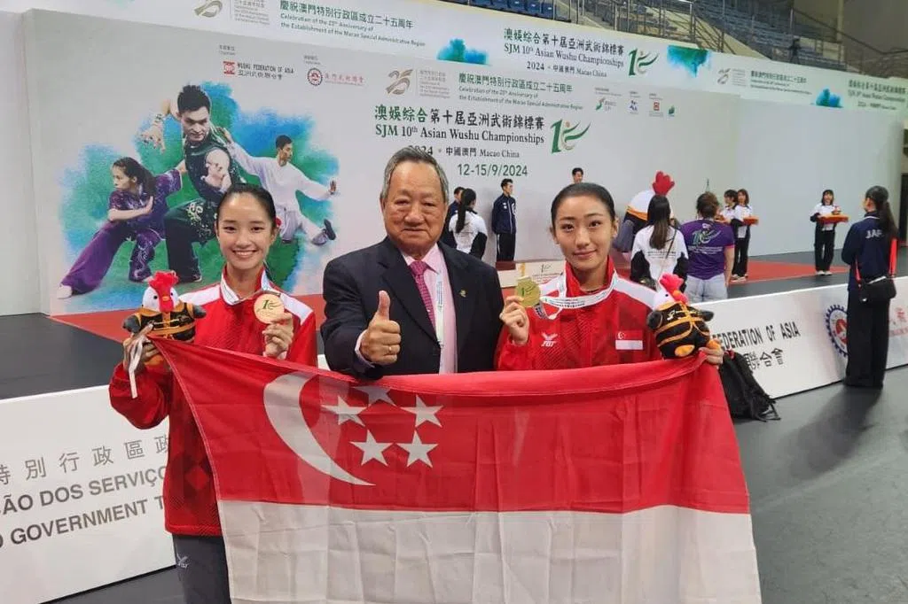 我国17岁小将黄乐婷同日在A组女子太极扇项目中以9.136分摘下一枚金牌,黄喆婷则以8.856分获得B组女子太极剑金牌。